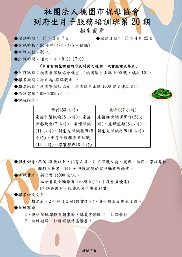 到宅坐月子第20期訓練課程 ( 假日班 ) 首頁 最新消息 到宅坐月子第20期訓練課程 ( 假日班 ) 報名表:/proimage/images/1765339777.pdf /proimage/images/1765339806.doc 簡章:/proimage/images/1765339832.pdf